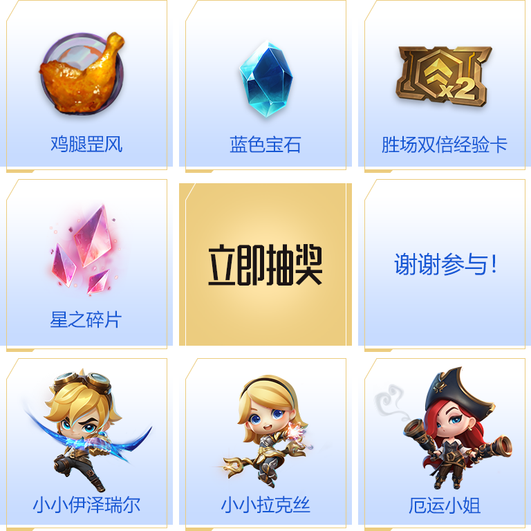 活动时间:10月15日至新赛季上线;预约金铲铲之战即可参与抽奖; 活动抽奖,游戏道具奖励将以cdkey的形式发放,玩家可通过游戏内的 【事件】一【石上角信箱】一(cdkey兑换】兑换; 小小伊泽瑞尔、小小拉克丝、小小厄运小姐单用户限定兑换一次